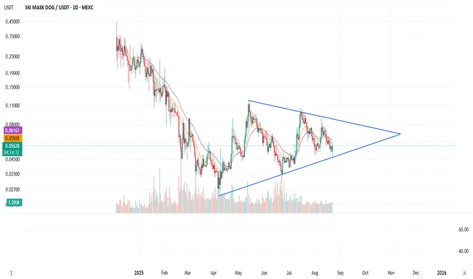 SKI/USDT has been consolidating inside a large symmetrical triangle since April.