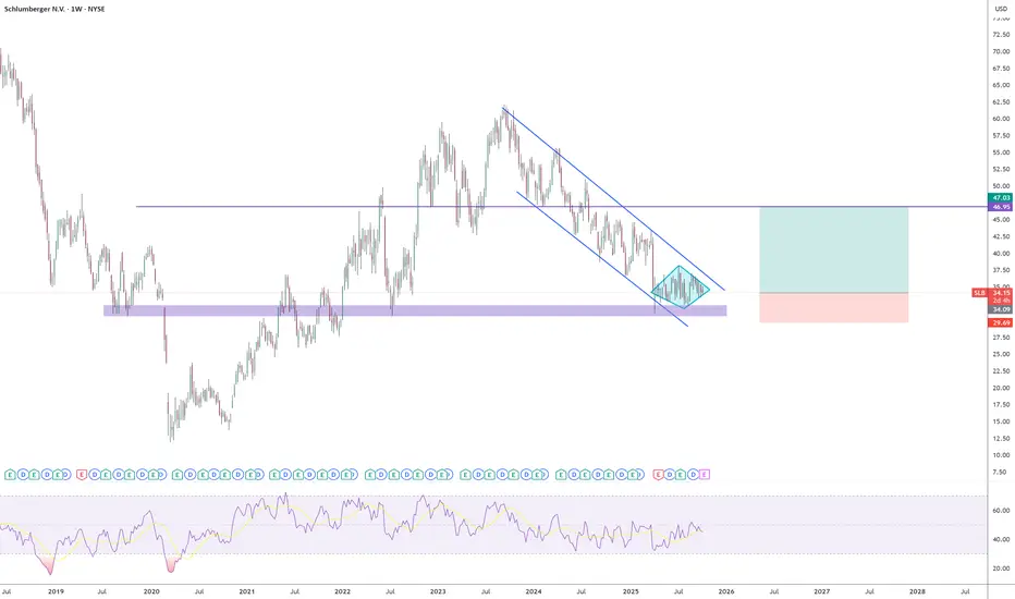 This very rare pattern usually indicates a change of trend. Is doing it in the weekly timeframe and setting up for a massive breakout of the descending channel. Also, oil is setting up an inverse HS and many of the big oil companies show bullish patterns. SL and TP are shown on the charts.