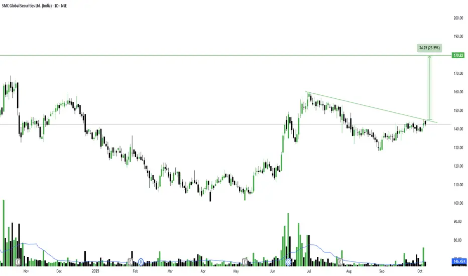 SMC Global Securities is currently showing a descending trendline breakout pattern on the daily chart. After months of sideways consolidation, the stock has started moving up with steady buying volume near the trendline resistance.