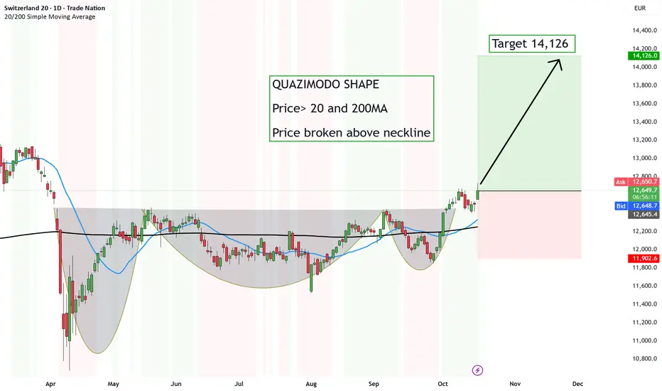 The Quasimodo pattern has completed beautifully, with price breaking above the neckline and holding firmly above both the 20-day and 200-day moving averages. This breakout confirms the shift from consolidation to bullish momentum, aiming toward the next key target at 14,126.Fundamental drivers supporting the move:
