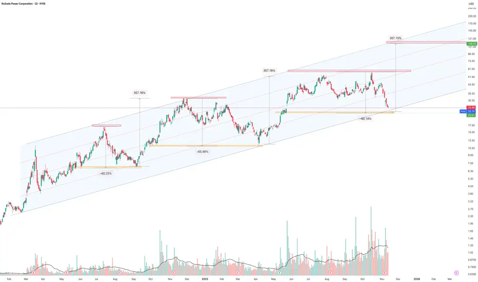 SMR is completing another textbook retracement in a long-standing, mathematically consistent price cycle. The technicals strongly suggest a high-probability setup for a multi-month 300–350% rally toward the $100–$120 range, assuming the rising channel and support levels continue to hold.