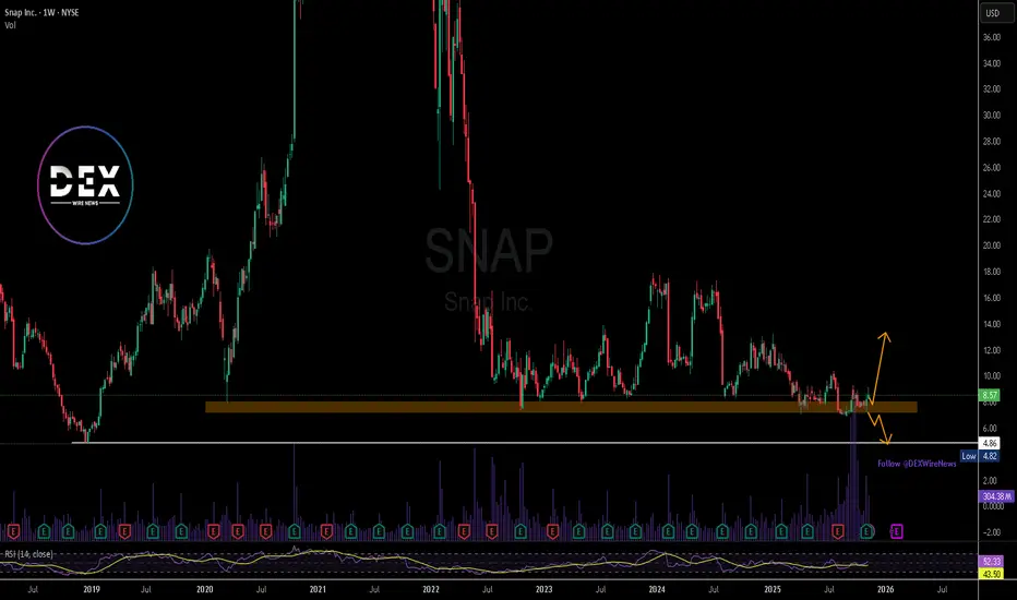Snap Inc. (SNAP) has spent the last two years in a slow, grinding consolidation after one of the largest boom-and-bust cycles in recent tech-stock history. Following its explosive rally to the $80 region during the 2021 tech mania, the stock collapsed sharply as advertising revenue weakened, interest rates surged, and competition from Meta and TikTok intensified. That sell-off pushed SNAP back to long-term support between $8 and $17 — the same zone that acted as a base in 2020. Today, price is still hovering around that level, suggesting the market is waiting for a major catalyst.