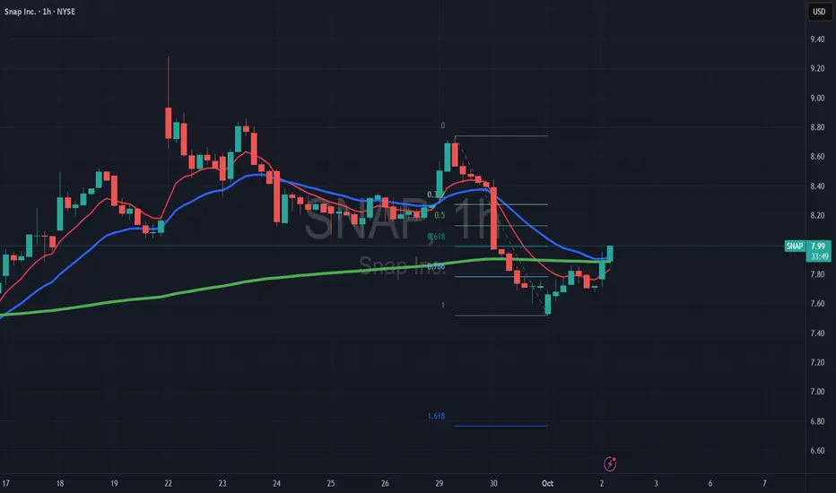 SNAP pulled back into the 0.618–0.786 Fib zone and tapped the 200 EMA before bouncing. We now see price reclaiming above the short EMAs (8/21), signaling early reversal momentum.