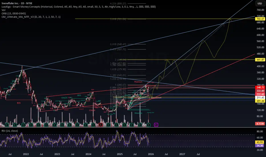 The projected yellow path highlights potential behavior, not prediction — SNOW historically cycles in expansions → compressions → expansions, and the current structure supports that narrative.