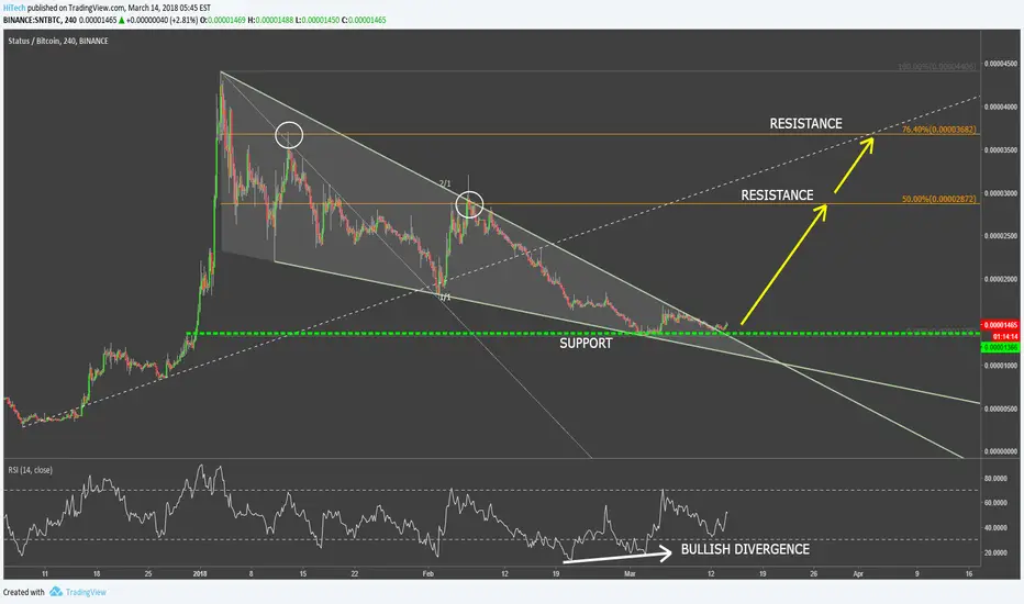 Status Network Token has found at 1500 satoshis area, where price formed a double bottom and at the same time RSI oscillator formed a bullish divergence suggesting the reversal of the trend. Yesterday SNT/BTC broke above the 2/1 Gann Fan trendline, which could be the first signal of the buying opportunity presence.