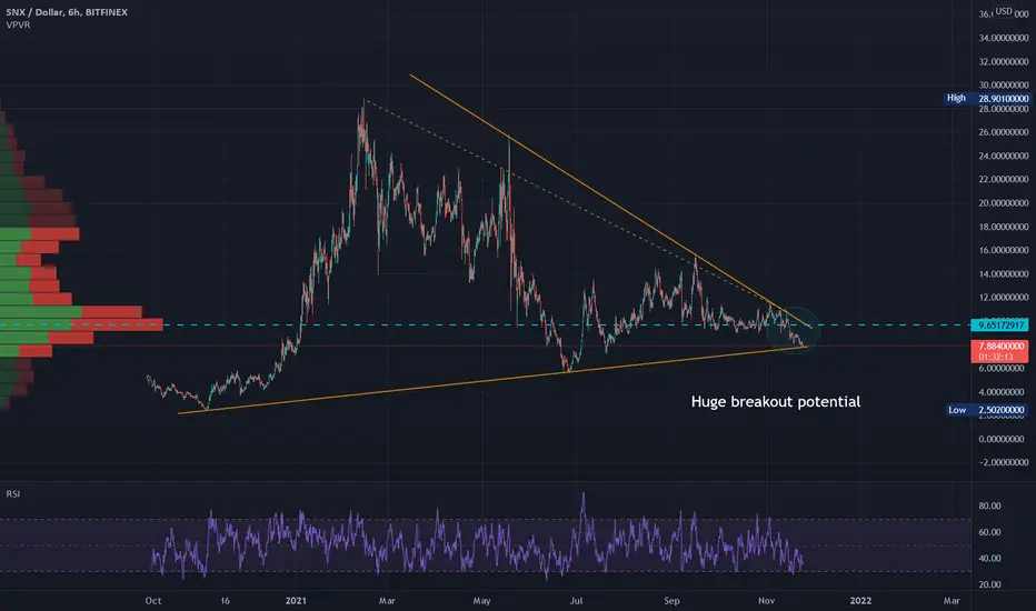 SNX been sitting on this support line triangle tip. Breakout?