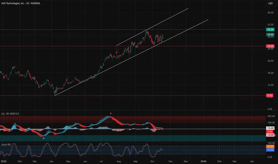 Market Structure: SOFI continues to respect its long-term ascending channel that’s been intact since the May reversal. The most recent correction held firmly at $24.80, forming a clean higher low — classic accumulation behavior from institutional players. We’ve now seen a Break of Structure (BOS) above $28.50, confirming a potential continuation leg within the channel.