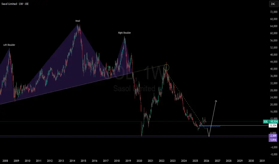 From our November 2023 analysis, medium-long term sentiments were strongly bearish towards R71. Price did behave as expected and went as far as printing a low around R53.01 in May 2025 before going on to print what seems to be developing into a Head and Shoulders price pattern between September and November 2025.