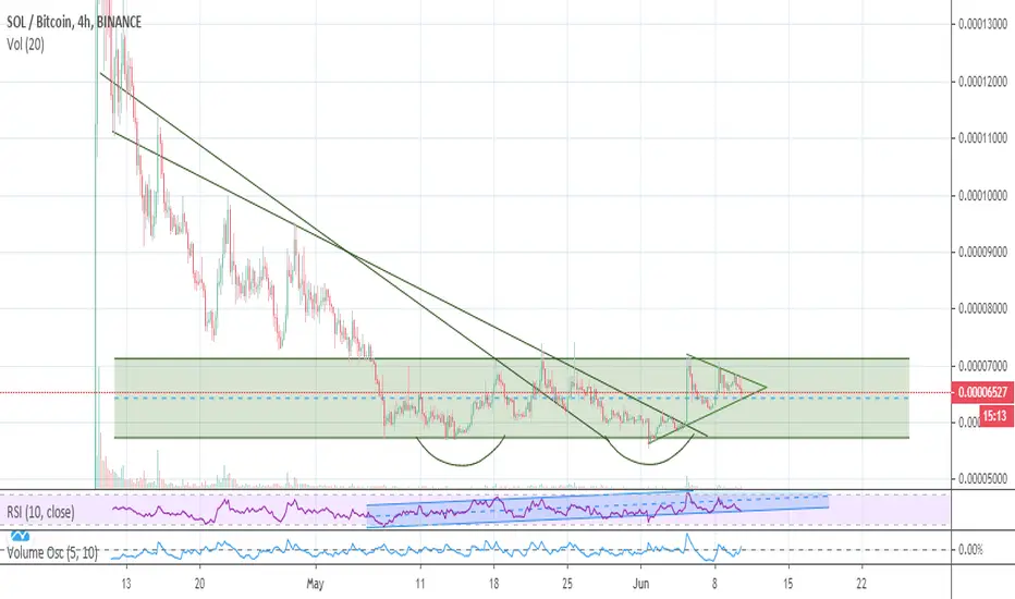 SOL/BTC It seems to have broken the down trend, stuck within a range, in possible accumulation? Double bottom, possible bullish flag on the 4 hour chart.