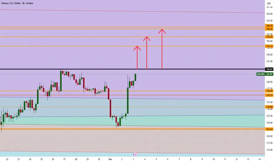 SOLUSD gets real only if we clear 144.67 with conviction. Above that, the levels to watch are 153, 156, and 159 for potential take profits.