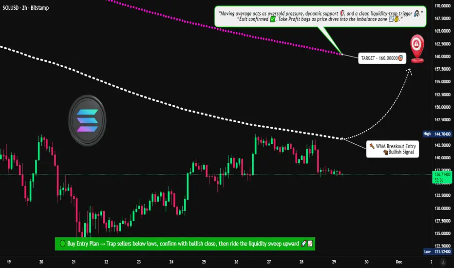 The bullish structure is confirmed after Weighted Moving Average (WMA) dynamic support breakout, signalling fresh momentum entering the market. This setup favors continuation as long as SOL holds above the breakout zone.