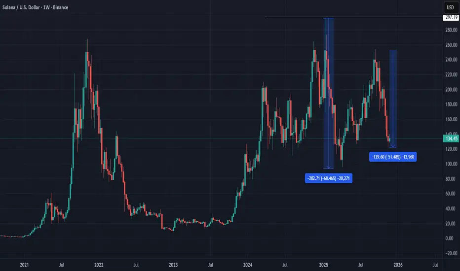 The price almost hit $300, then made a very strong correction of around 68%. After that, the market struggled to bring the price back to $250, and it quickly fell again to around $135. This tells me that the zone between 200–300 was used by whales as a distribution zone. They sold heavily while the market was excited, and the weak recovery shows that buying pressure is not strong anymore.