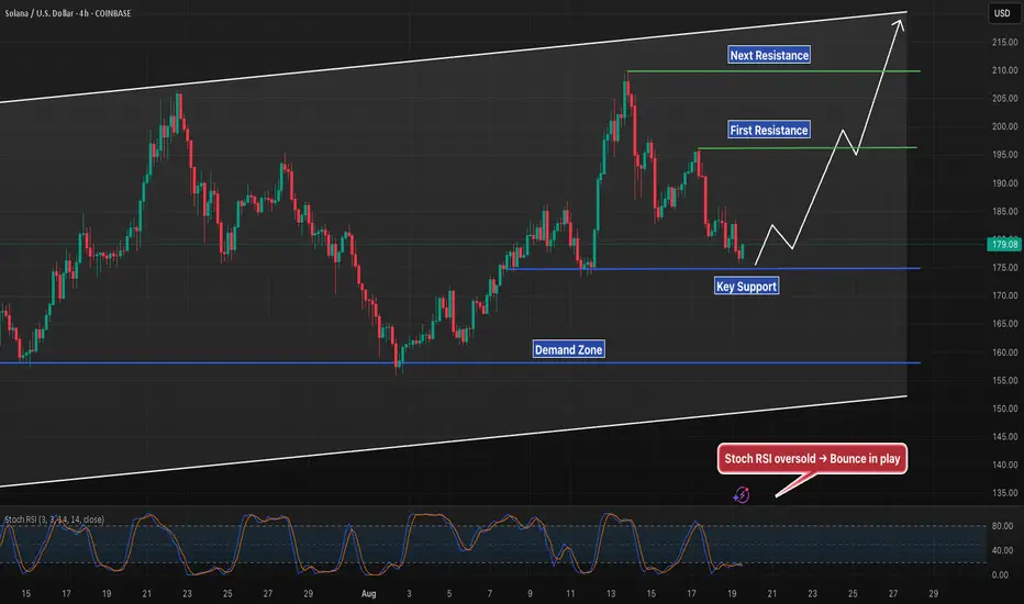 Solana is defending the 176 support zone while trading inside a rising channel. Momentum is oversold on the 4H Stoch RSI, suggesting buyers may attempt a defense here.