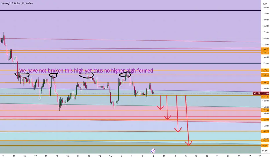 It appears we have not made new higher highs in price action on the 4 hour and thus a possible movement down to $108 then 100 levels make sense. However if we can break 139 level then 147 can make sense going up.