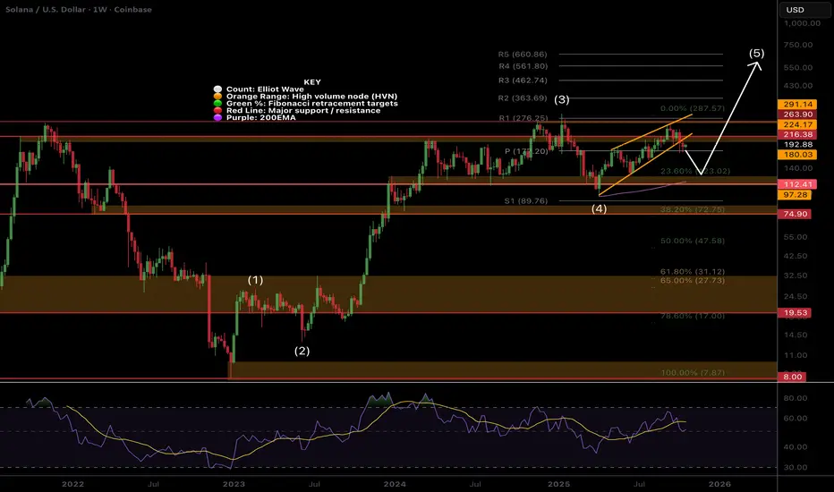 Weekly RSi is crossed bearish but price remains above the weekly pivot and EMA which is bullish. Direction is ambiguous for now. A push back into the wedge would flip the outlook bullish.