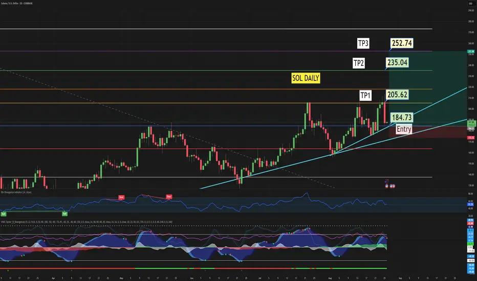 SOL is at an important level right now. On the secondary trendline and at a 0.5 Fib pulled from ATH to April Low.. And currently on smaller time frame its in the middle of fibs with liquidity up and down.. So With BTC coming down to 108.8 after hours and Sol coming down to 187 kinda in the middle of noting I wouldn't be surprised for BTC to retest 108.8-107.500k (golden pocket) 618 fib tomorrow am market open and maybe Sol gets to 184.. Either way in this 185-180 range I like SOL for a move up to 232-252 if we get a bounce. If BTC falls below 106 this fails too so just keep a watch on both But looks very nice.