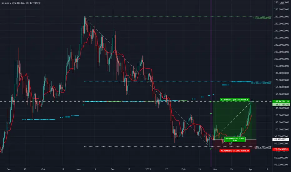 SOLUSD has hit the primary target of the spike trade from the bottom of the consolidation which is also at a Resistance. This would be a good time to take off risk. The next Resistance I would be watching is 167 which is the 50% Retracement of the bearish trend of the last few months.