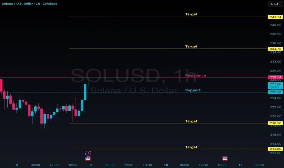 🟢 Bullish Scenario (If Strength Holds)If SOL breaks above 228 with conviction (strong candle, good volume), expect momentum toward 234 first, and if that’s taken, a push toward 241.