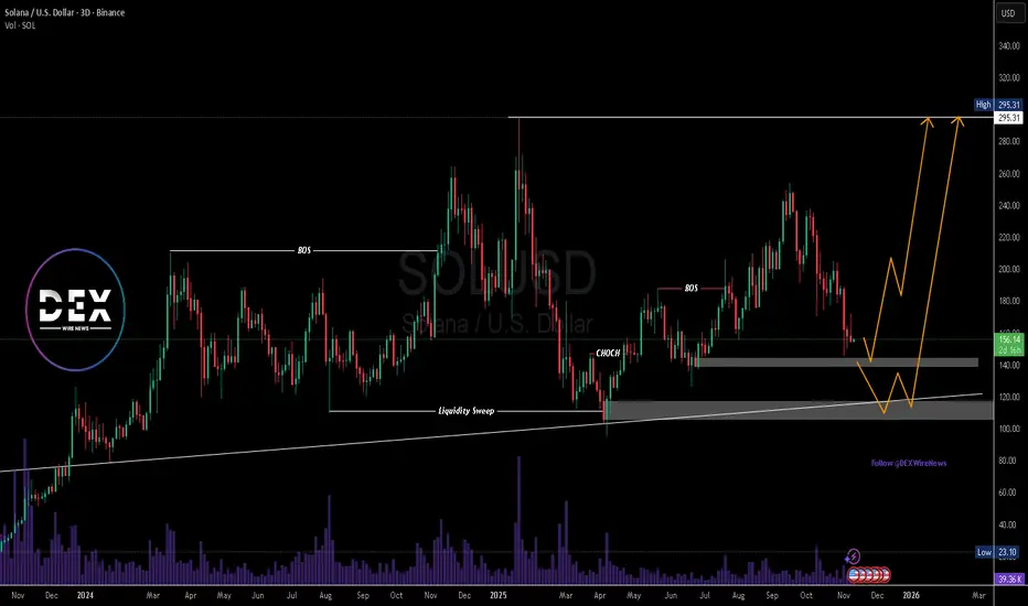 Solana (SOL/USD) is approaching a pivotal technical zone that could define its next major move. After an extended corrective leg from the $254 region, the price has retraced toward key demand areas, around $140, and around $120 where prior liquidity sweeps and structural reversals have historically emerged.