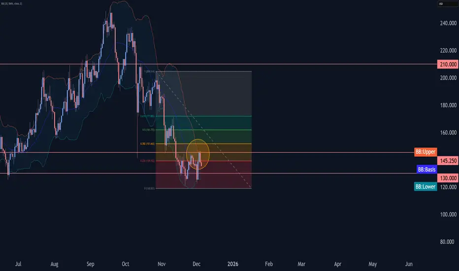 Solana cryptocurrency pair recently reversed down from the resistance zone between the resistance level 145.25 (former strong support from October and November) and the upper daily Bollinger Band.