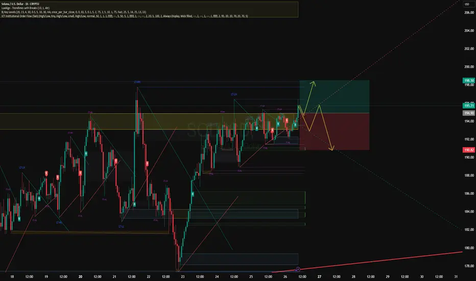 Bullish scenario: SOL holds support at ~$197, then breaks through ~$260.83 → possible rise to ~$300+.