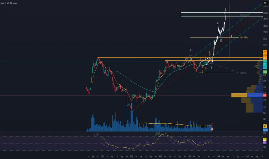 I believe we have completed a leading diagonal on solana and are preparing to head into a 3 of 3 phase and break the massive cup and handle pyscological formation. Cup and handle target is quite high on log, $7500 range. This may be a longer term consideration, but my target range is 1k initialy, 3500 on the next leg after a consolidation around 1k.