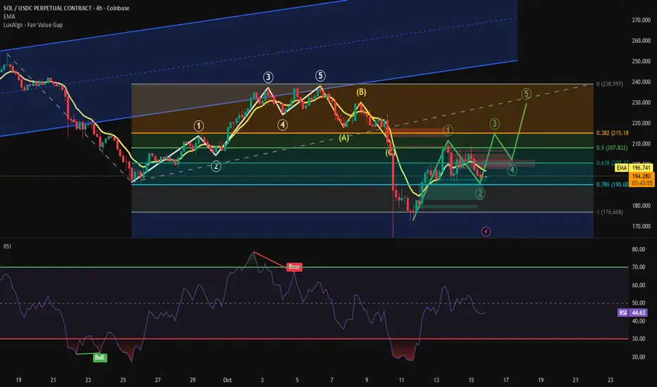 No clue what's going on since the rate cut announcement. Big dump then sideways the last 5 days. The green 5 wave move is my best guess at what's next. I can't see a long term bearish scenario with all the bullish news & sentiment. The sideways action is hella boring and makes ppl what to exit. Sideways boring action is most often bullish from my experience. It might be a couple more weeks of sideways boredom until the next Fed rate cut expected the end of October. Anything between 190 and 240 "feels" sideways. It's a wide range but we were at 240 Oct 6th just 10 days ago and currently 194. Remember SOL was at just $95 April 7th. $129 June 23rd. It'd take a major event, black swan even, to dump that hard. I think we're at the quarterly low. I'm expecting a bull but 60/40 chance is my feeling near term ( next 2 weeks). I don't expect a big move until the next Fed rate announcement. Hurry up and wait!