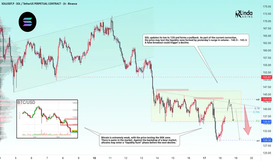 SOL is updating its low to 129 and forming a pullback. As part of the current correction, the price may test the liquidity zone formed by yesterday's surge in volume - 140.5 - 143.3