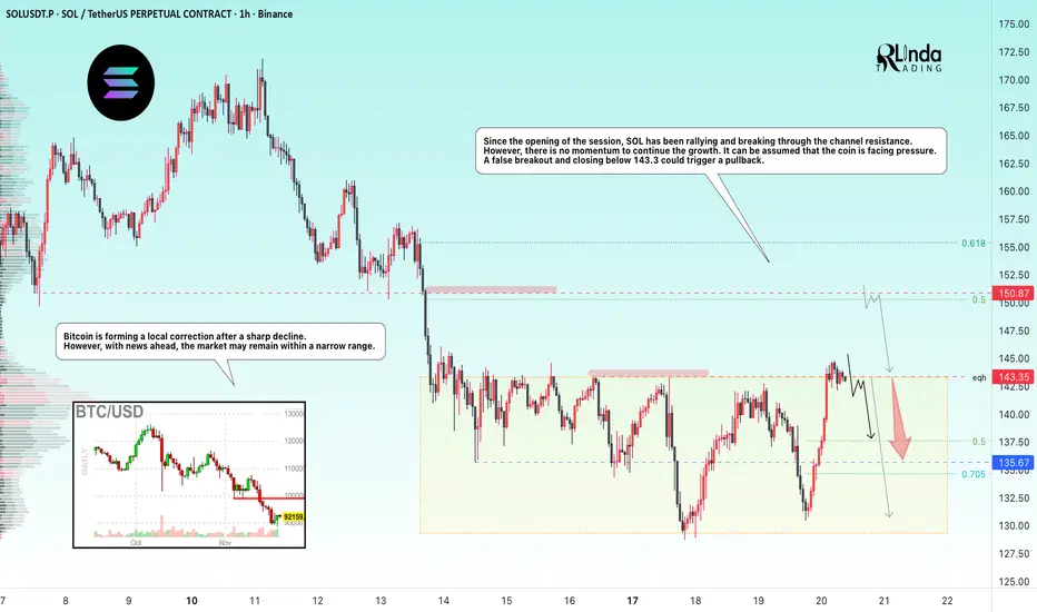 From the opening of the session, SOL rallies and breaks through the channel resistance, wasting 75% of its intraday growth potential. However, there is no momentum to continue the growth. It can be assumed that the coin is facing pressure. A false breakout and closing below 143.3 could trigger a pullback.
