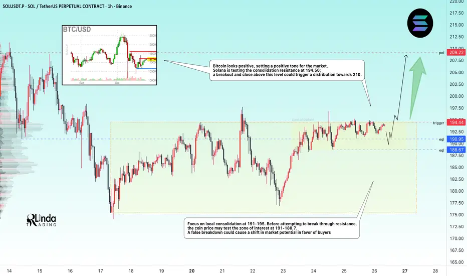 SOLUSDT.P is testing the resistance of the trading range, with pre-breakout consolidation forming, indicating that buyer interest in the coin is emerging.