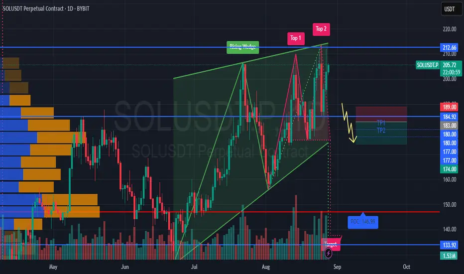 ➡️ On the daily chart, a Rising Wedge has formed — a bearish pattern signaling potential reversal.