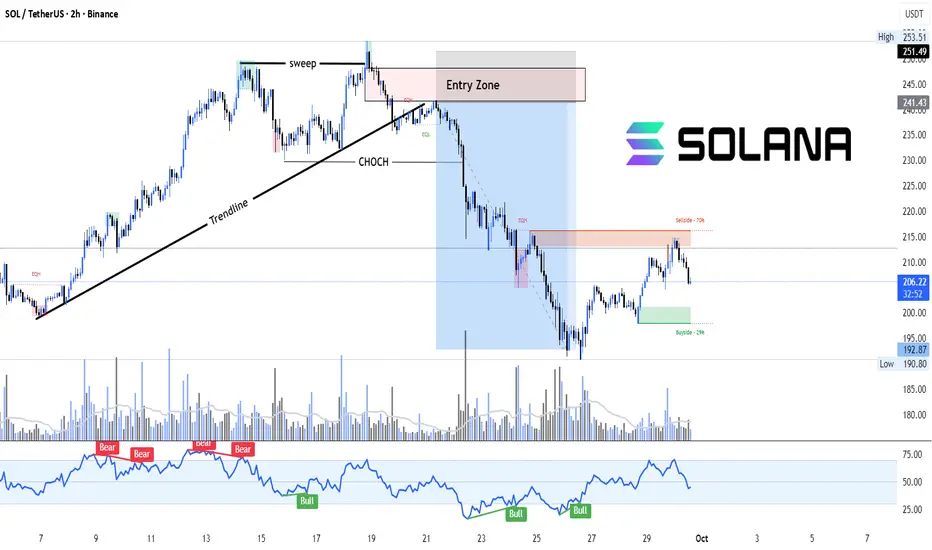 Solana (SOL/USDT) recently broke below a strong trendline after a liquidity sweep and clear Change of Character (CHOCH). Price retested the supply zone (Entry Zone) before continuing its downward move, showing a classic bearish market structure shift.