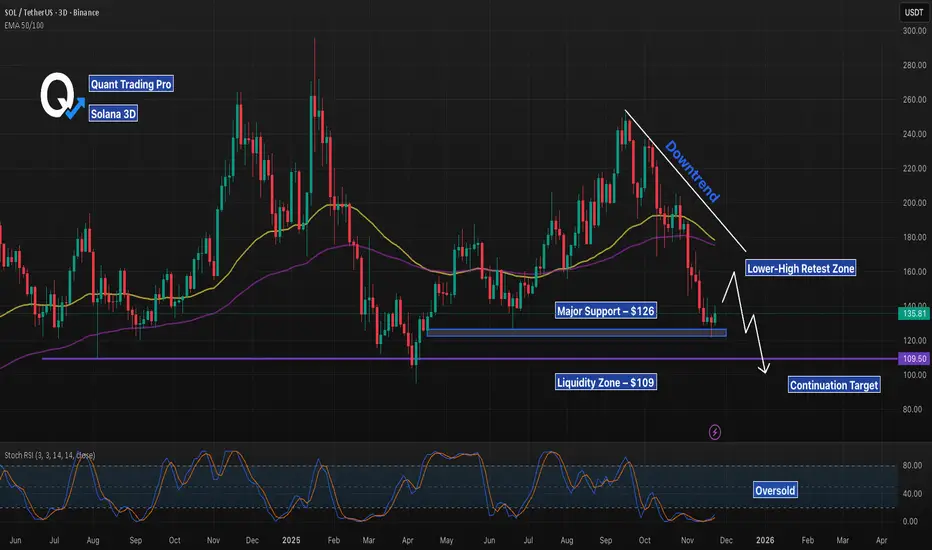The first major area of interest is the $126 support, which has acted as a key reaction level across multiple months. A clean break of this level opens the door toward the lower $109 liquidity zone, which historically attracts deep wicks and stop-hunts before reversal attempts.