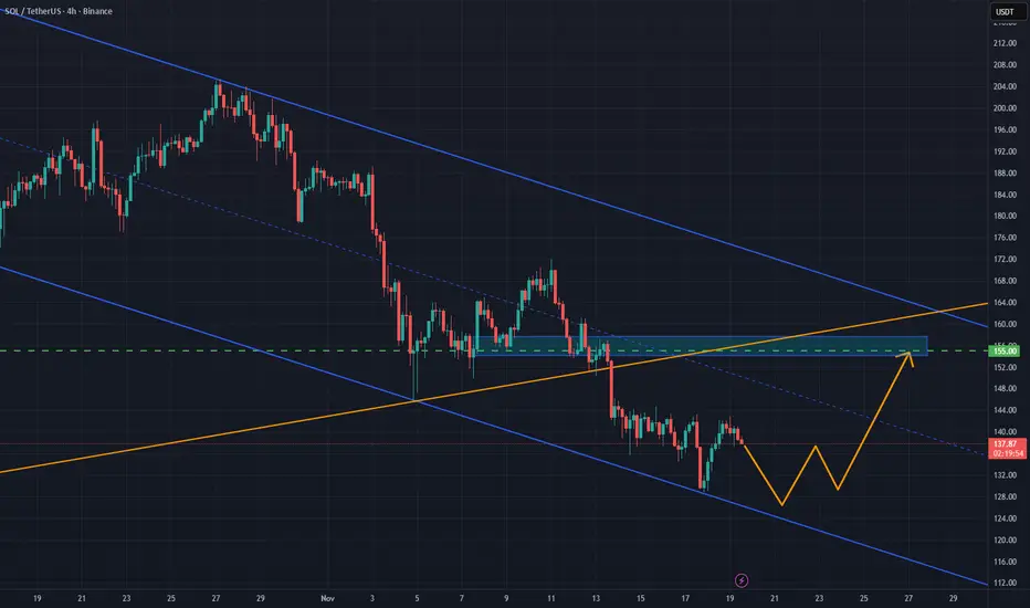 SOL/USDT bounced strongly from the 128–130 support zone, reacting off the lower boundary of its downward channel. While the broader trend remains bearish, this move signals early signs of accumulation. Holding above 130 could open a corrective rally toward 155, as oversold conditions unwind and short-term momentum favors a relief push.