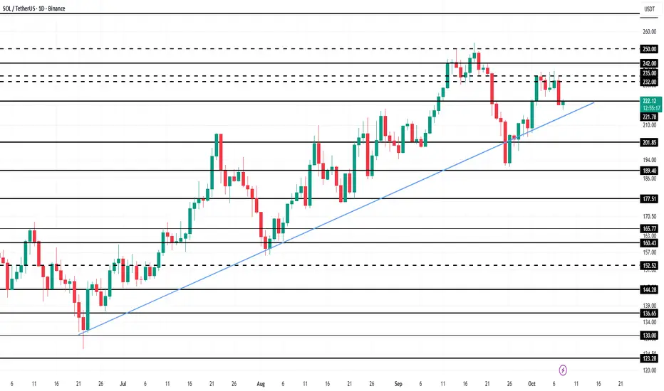 At press time, Solana trades at $222, hovering just above the $221 support level. The altcoin has been in a consistent upward trend for the past three and a half months, making this level crucial for maintaining market structure.