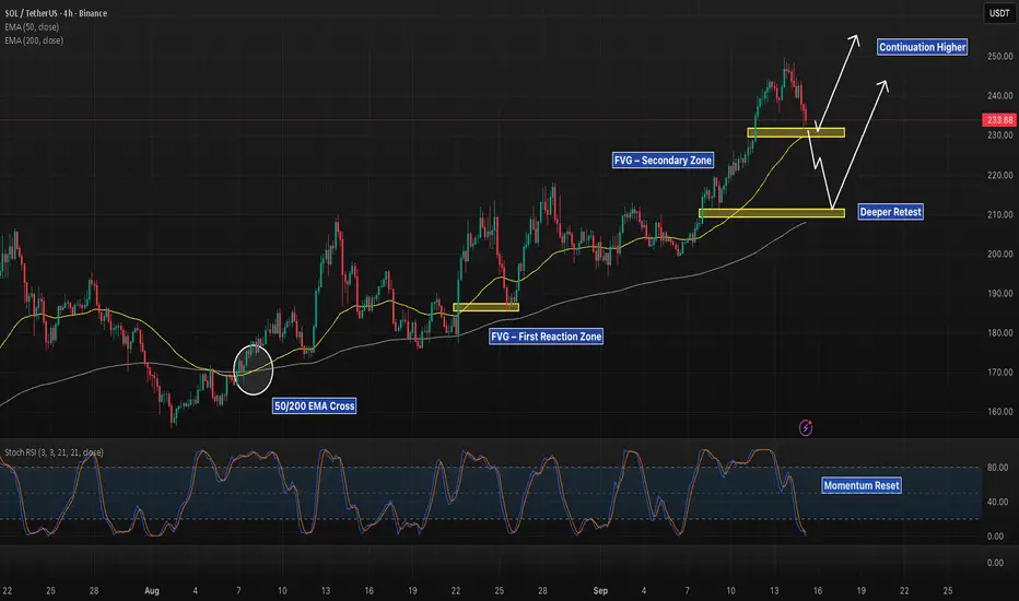 Solana’s trend remains bullish following the August 50/200 EMA cross, but price has pulled into a key FVG at 230. This first zone aligns with the 50 EMA, making it an important test for continuation.