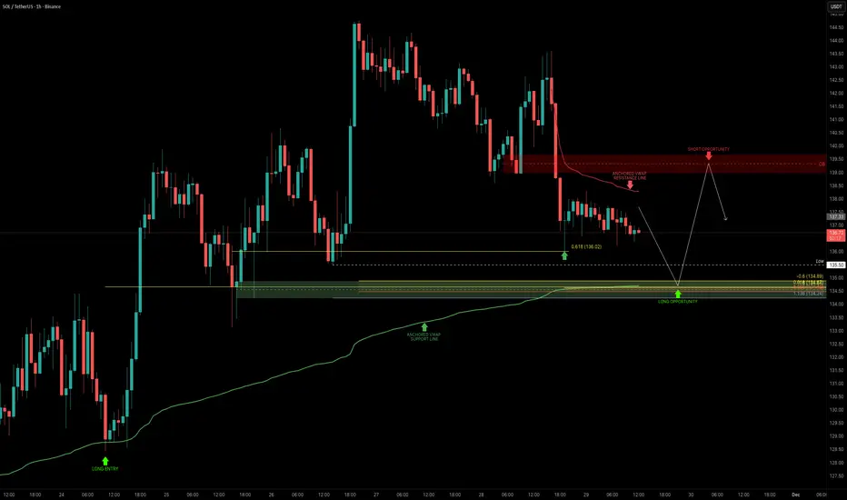SOL Update:Both setups played out beautifully =) precision trading at its finest. First the long entry from the anchored VWAP support in confluence with the -0.618 Fib, followed by the short from the anchored VWAP resistance aligning with the 0.6 Fib.