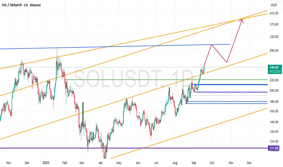 Solana maintains a bullish outlook while trading inside its ascending channel. The medium-term upside targets stand at $290 and $370, with key supports at $220–200. Short-term corrections are possible, but the overall structure favors further upside as long as $200 holds.