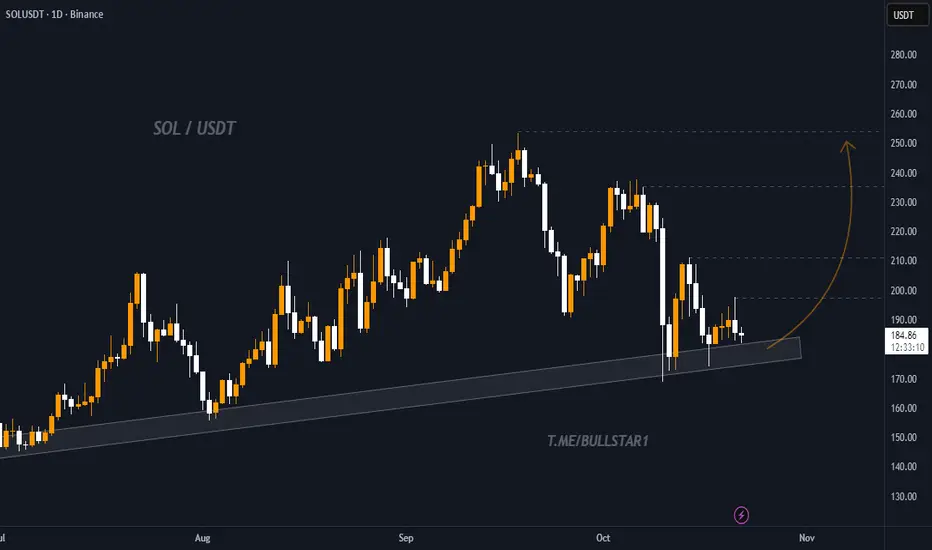 Solana (SOL) is currently retesting a strong ascending trendline that has held as support since mid-2024. The price recently bounced around the $175–$185 zone, which has acted as a major demand area multiple times in the past.