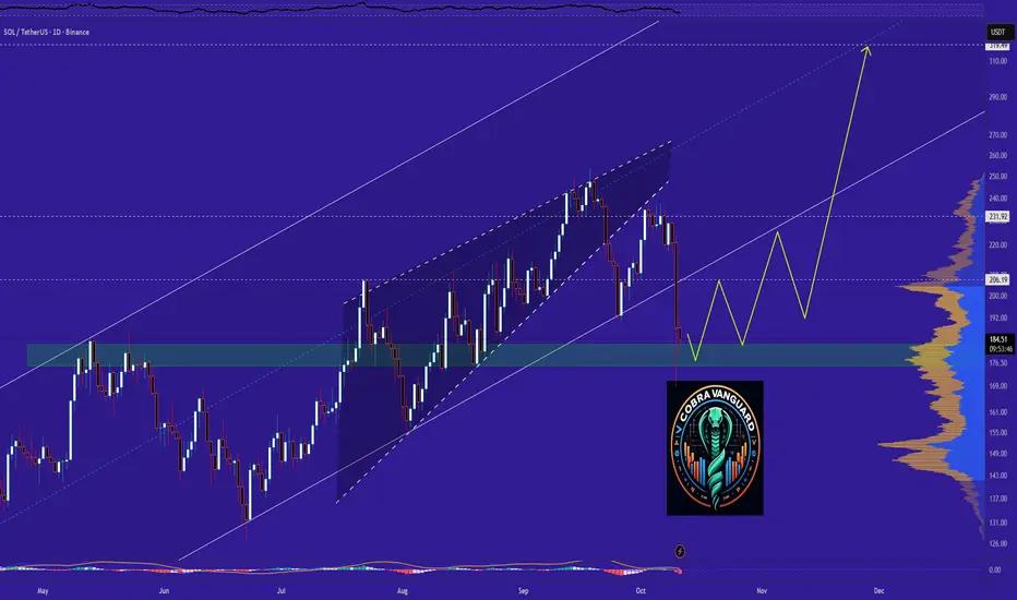 has broken below its ascending channel support near $190, signaling short-term weakness. If buyers fail to reclaim this level, price could test the $150–$160 demand zone. A strong rebound from that area might restart the uptrend toward $220–$240.