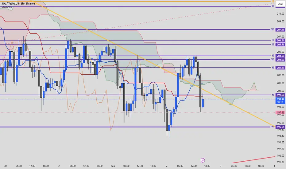 On the 1H chart, Solana is ranging between key support and resistance levels (marked in purple, derived from higher timeframe Ichimoku levels).