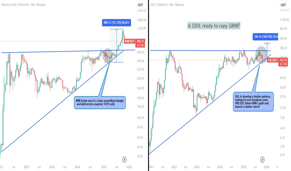 Will SOL follow BNB’s path and launch a similar move? A structure like this could set the stage for a big run if support holds. Share your views—is