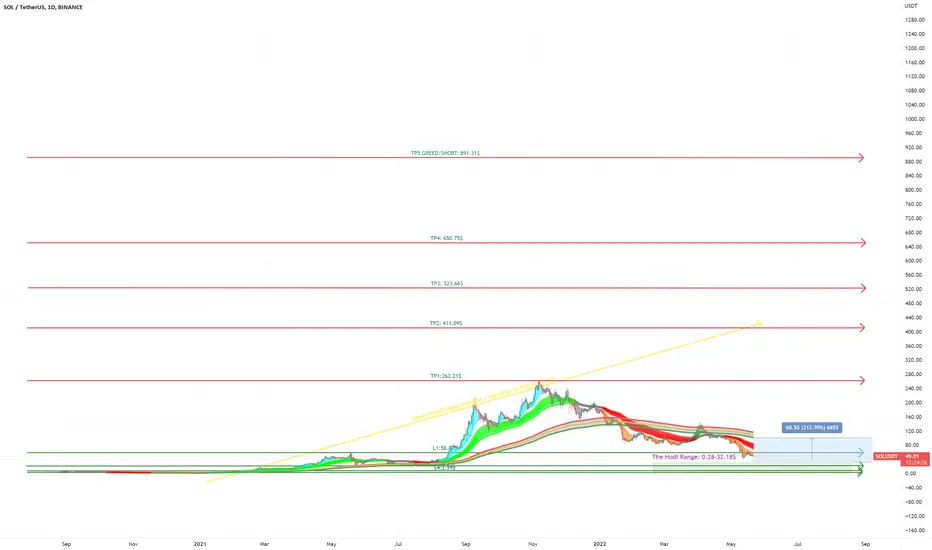Long term chart for SOL. Levels of interest for buys and take profit. (Take profits are not expected to be reached until after the FED is done with tightening, and possibly a couple of months after a return to neutral policy.)