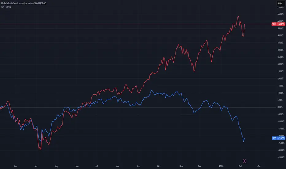 Software stocks have seen a massive selloff, while semi stocks are moving the opposite way. The reason behind the popular trade is a fear, that software will be replaced by AI. Altough the revenue of software stocks, are not decreasing accordingly, what may suggest that the trade does have more panic as fuel, rather than merit.