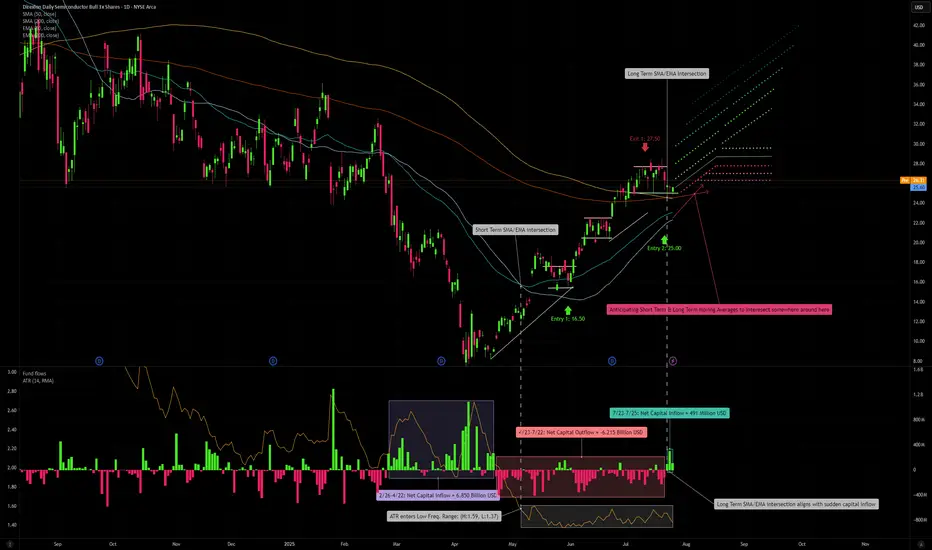 If we look at our short-term 50-day SMA/EMA, you will notice a crossover occur on 5/6, a minor indication of a short term positive trend. Alone this is insignificant, but if we look at our 14-day Average True Range, we can see that this crossover aligns with a fall in ATR that would persist between the values of 1.37 and 1.59. This low ATR value signals that trailing volatility is actually quite low for semiconductors, considering the currently mixed market sentiment. Further along we see that price has crossed above both our long-term, 200-day SMA/EMA and a crossover occurred between the two on 7/23, serving as a small indication of a positive long term trend. Once again, not super significant on its own, but you will notice that the convergence aligns perfectly with a sharp increase in fund inflows, netting 491 Million USD in a matter of 3 trading days. If we see a continuation of net inflows over the several days, we can expect a near future extension of our bull rally, a semi-cyclical wave of inflows that concentrate during consolidation periods (which we have seen take place in the current price range between 25-28 USD following my first exit at 27.50 USD). If we extrapolate both our short-term and long-term SMA/EMA, we can anticipate a crossover to occur in the coming days to weeks. If this occurred, that would further reinforce our expectation for a positive long term trend. I have already locked in my entry 2 with a limit order executed at 25 USD. If all of the above conditions are met, I would confidently predict that we may see SOXL trade at around 42 USD in the coming months.