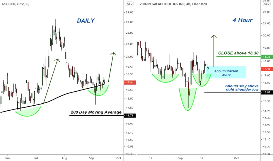 On the right chart we're looking at the 240 min/4hr time frame where price currently displays a possible H&S construction. The stock is at a good accumulation zone here as long as the recent lows hold.