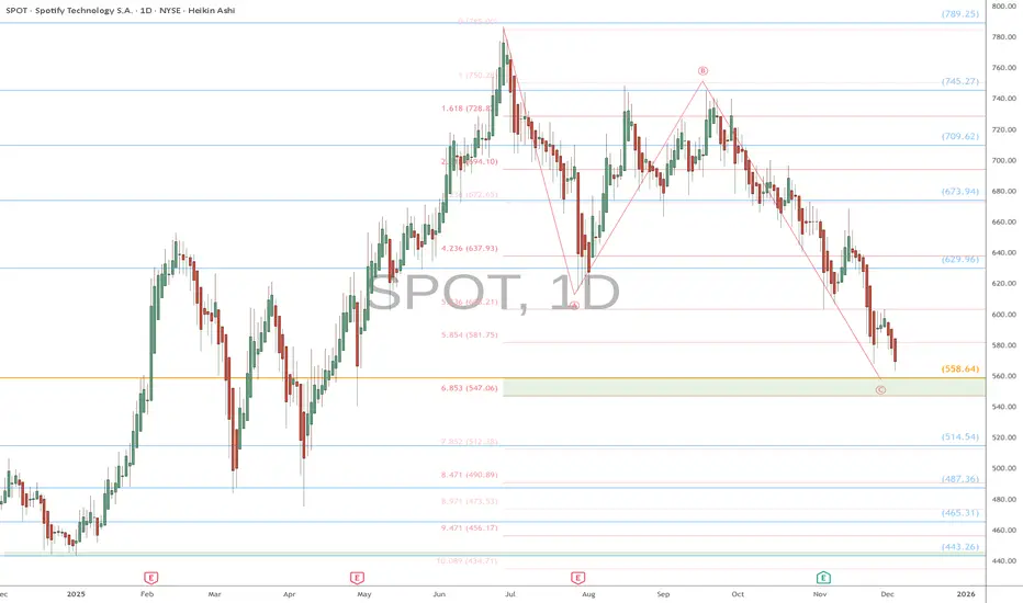SPOT watch $547-558: Key support zone may end the ABC correction