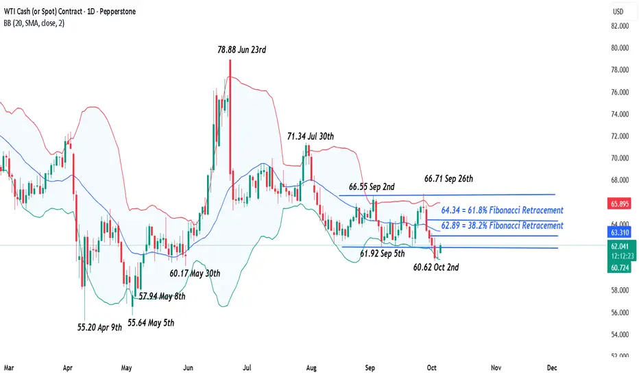 Throughout August and September, Oil (WTI) traded in a broadly sideways range, reflecting a tug-of-war between buyers and sellers with no clear directional bias. As the chart below shows, this consolidation unfolded between support at 61.92 (September 5th low) and resistance at 66.55/66.71 (September 2nd and 26th highs). This balanced structure underscored recent trader indecision, with a breakout of either side needed to suggest the possibility for an increase in volatility.