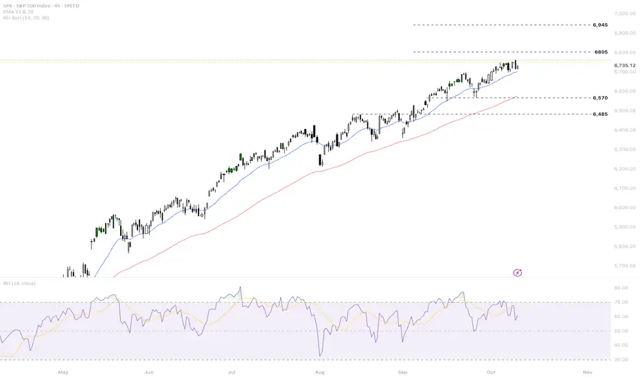 The US500 is currently consolidating near 6,735 points after its recent peak. The dominant trend remains bullish, supported by the fact that all major Moving Averages (10 to 200 periods) are in "strong buy" territory. Momentum indicators like the RSI are approaching overbought levels, suggesting the rally needs a brief pause but have not yet signaled a reversal.
