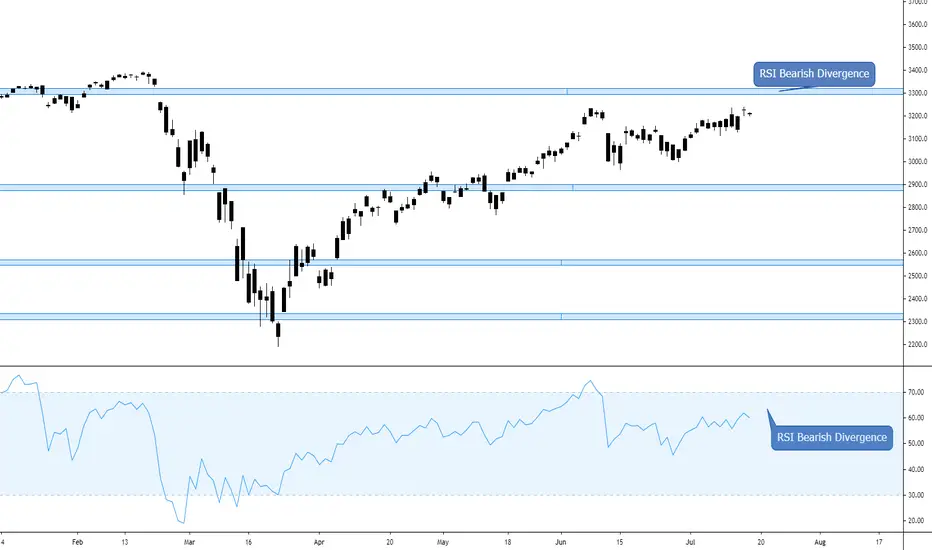 As for the other lower gaps? Well that is a little less certain. We would have to see volatility return with a vengeance to see that happen. We are talking VIX 50-70. If we go down to the last gap, I would say that we go below the 2200 support level. This would also give us room for a bullish divergence on the weekly RSI, which is a good indicator for the start of a new bull run. But for now, all we are looking for is a place to take some profit, and seeing an RSI bearish divergence on the daily would be a signal. We need to see the price put in a higher high and the RSI put in a lower high.